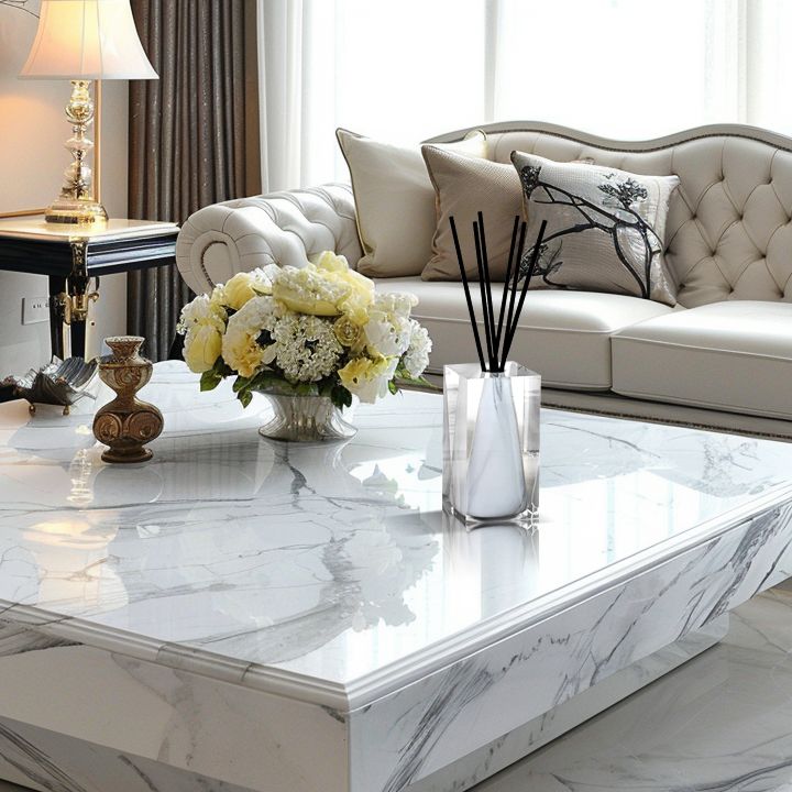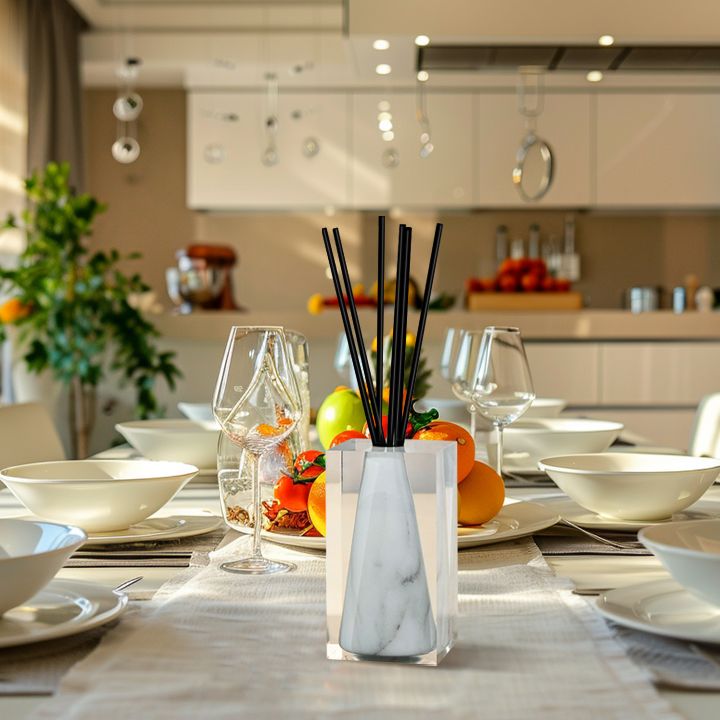 A luxury scenting vase sculpted of lucite and white marble. The Renaissance Reed Diffuser is a beautiful scent decor piece. Modern design meets lush fragrance.