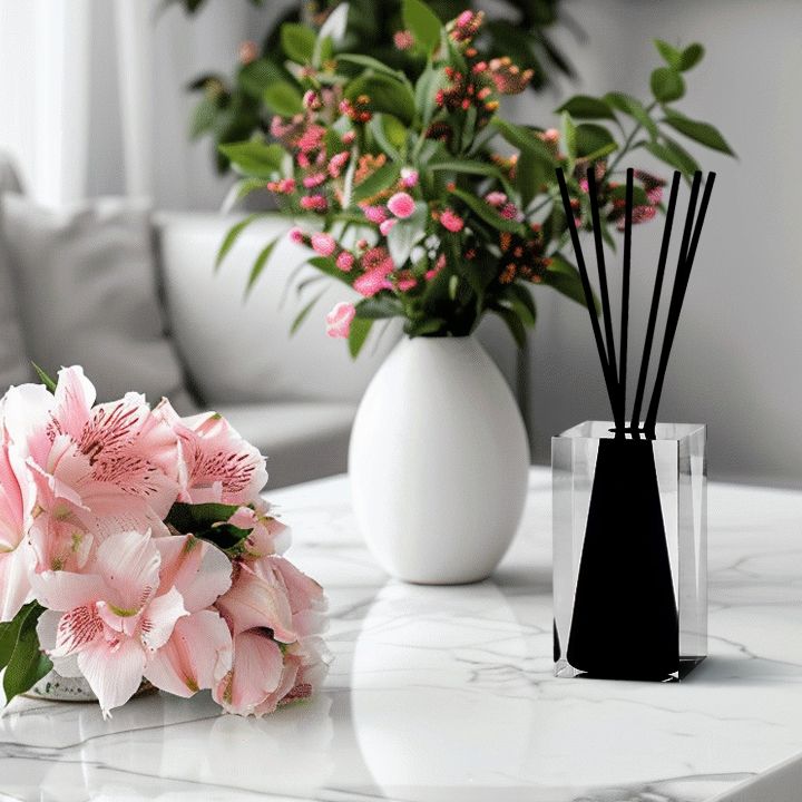 A luxury scenting vase sculpted of lucite and polished black stone. The Renaissance Reed Diffuser is a beautiful scent decor piece. Modern design meets lush fragrance.